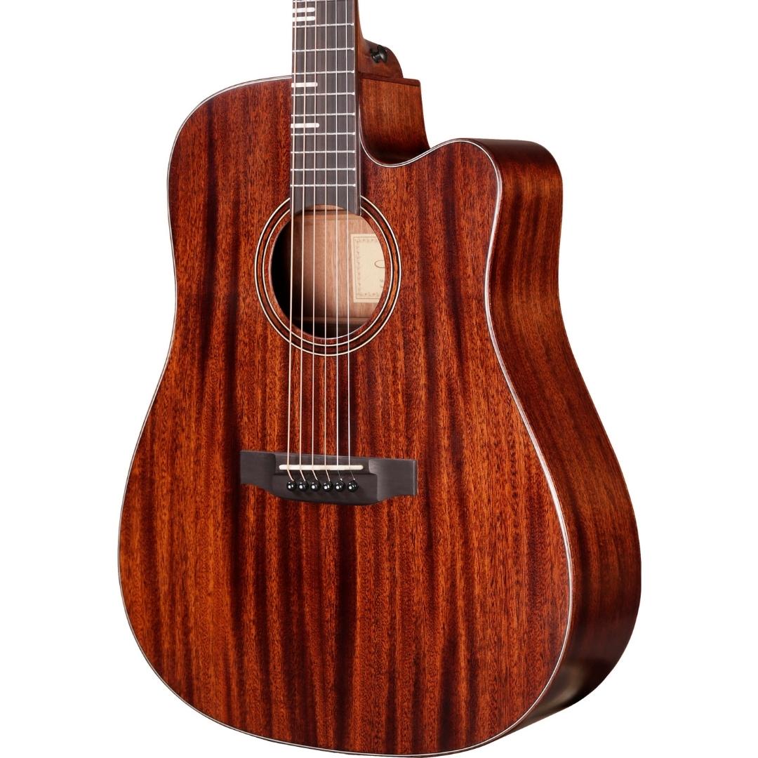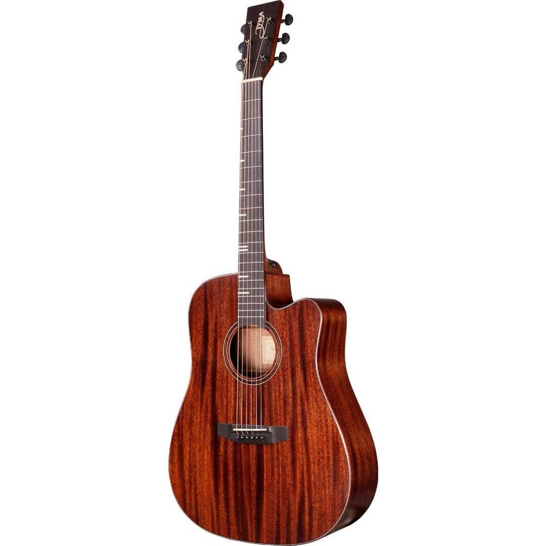 The Tyma HDCE-350M is equipped with a built-in pickup and cutaway. The back and sides are made from African mahogany, while the top is constructed with a traditional x-bracing, which gives the Tyma HDCE-350M a higher volume and a fuller tone. The sound of the Tyma HDCE-350M is warm and harmonious, with a slightly smaller volume, as well as a good balance between the thin and the thick strings. A body made exclusively from mahogany adds warmth to the guitar.