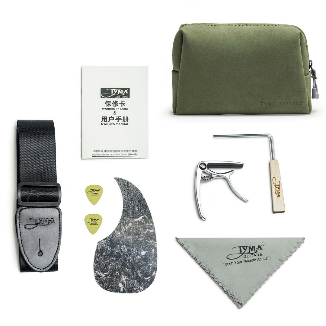Tyma TG-10E is equipped with a built-in pickup. The Tyma TG-10E is an exclusive and exquisite instrument that offers features that we rarely see in this price range. On the Tyma TG-10E, Tyma has applied new design principles and construction methods that elevate the Tyma TG-10E to a higher class. The tyma TG-10E is constructed with Tyma's new Double-V bracing, which makes the top on the Tyma TG-10E significantly more flexible. The neck-joint is also new, and gives a more uniform neck, which feels comfortable all the way up the fingerboard.