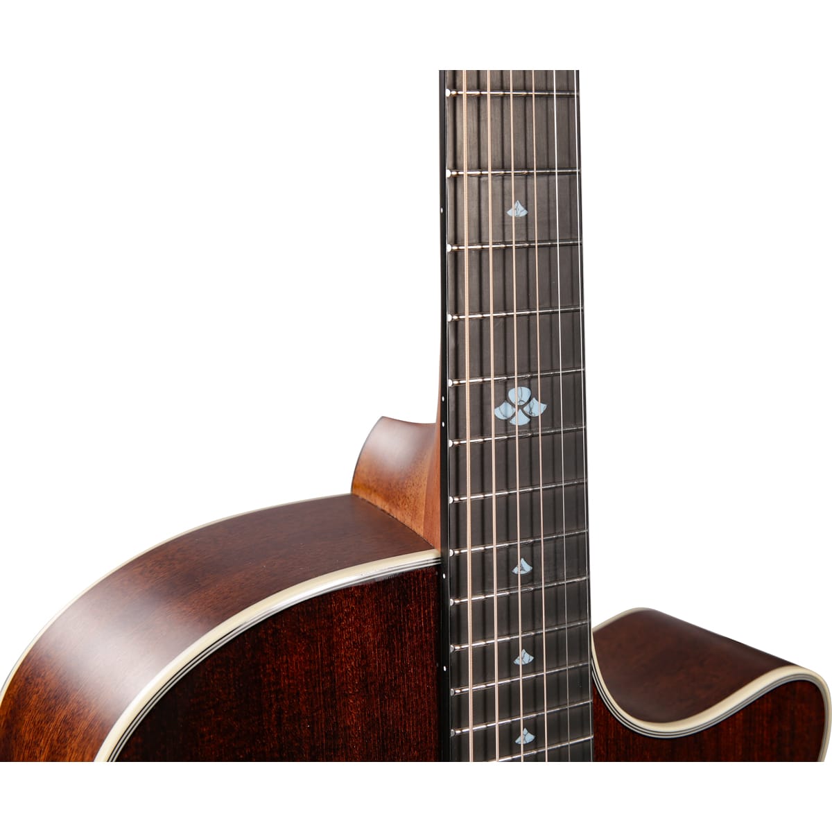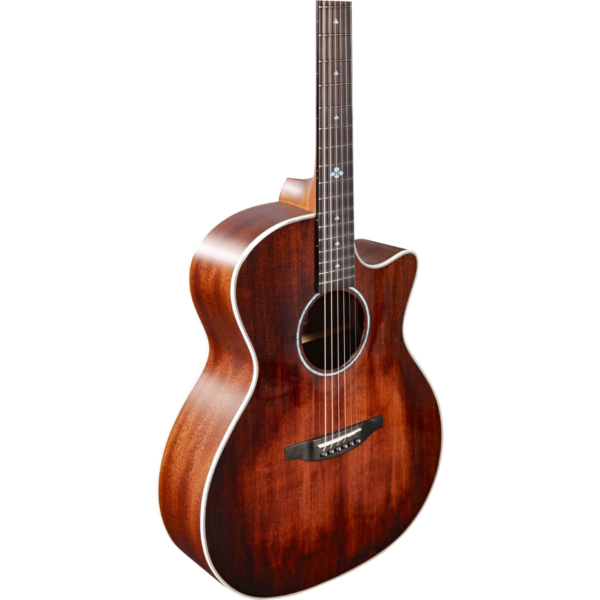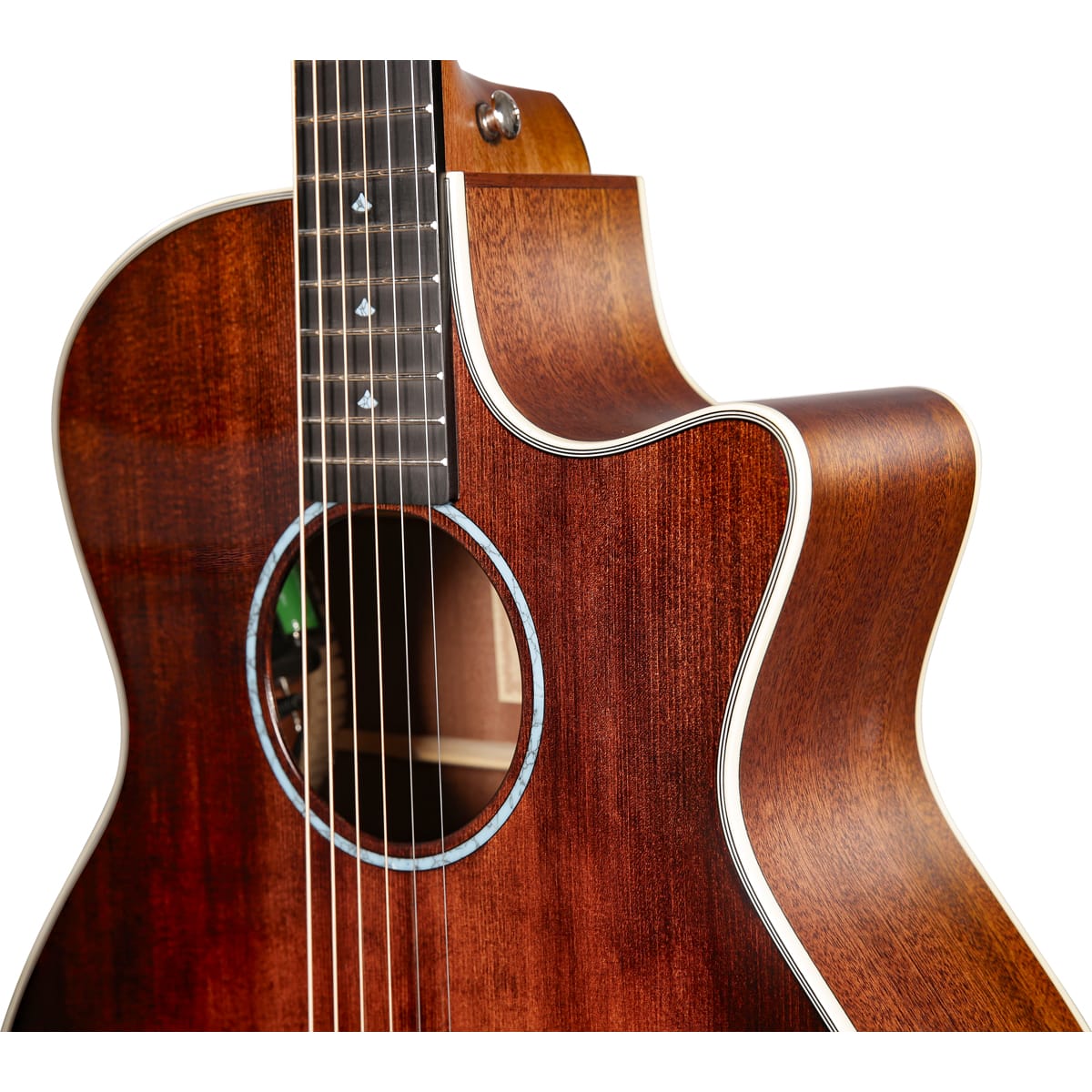 Body and Materials: Lightly carbonized Sitka spruce veneer top and sapele veneer back and sides, providing bright highs and warm mids with strong bass. The Grand Auditorium shape ensures a versatile and comfortable playing experience.